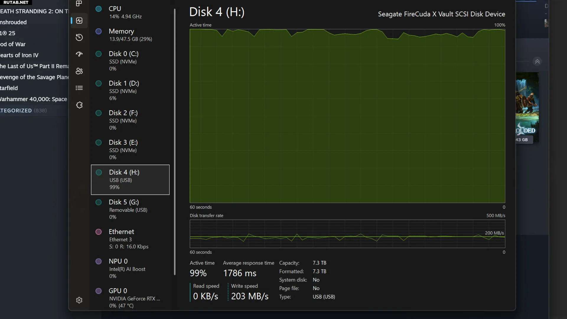 Поскольку игра весит 116 ГБ, на перенос всех файлов ушло 11 минут 31 секунда — так что повторять эту процедуру часто явно не захочется. Во время перемещения я зафиксировал скорость записи диска Seagate: она держалась в диапазоне 200–205 МБ/с на протяжении всего процесса. Скорость не рекордная, но очень стабильная (что, опять же, ожидаемо для HDD).