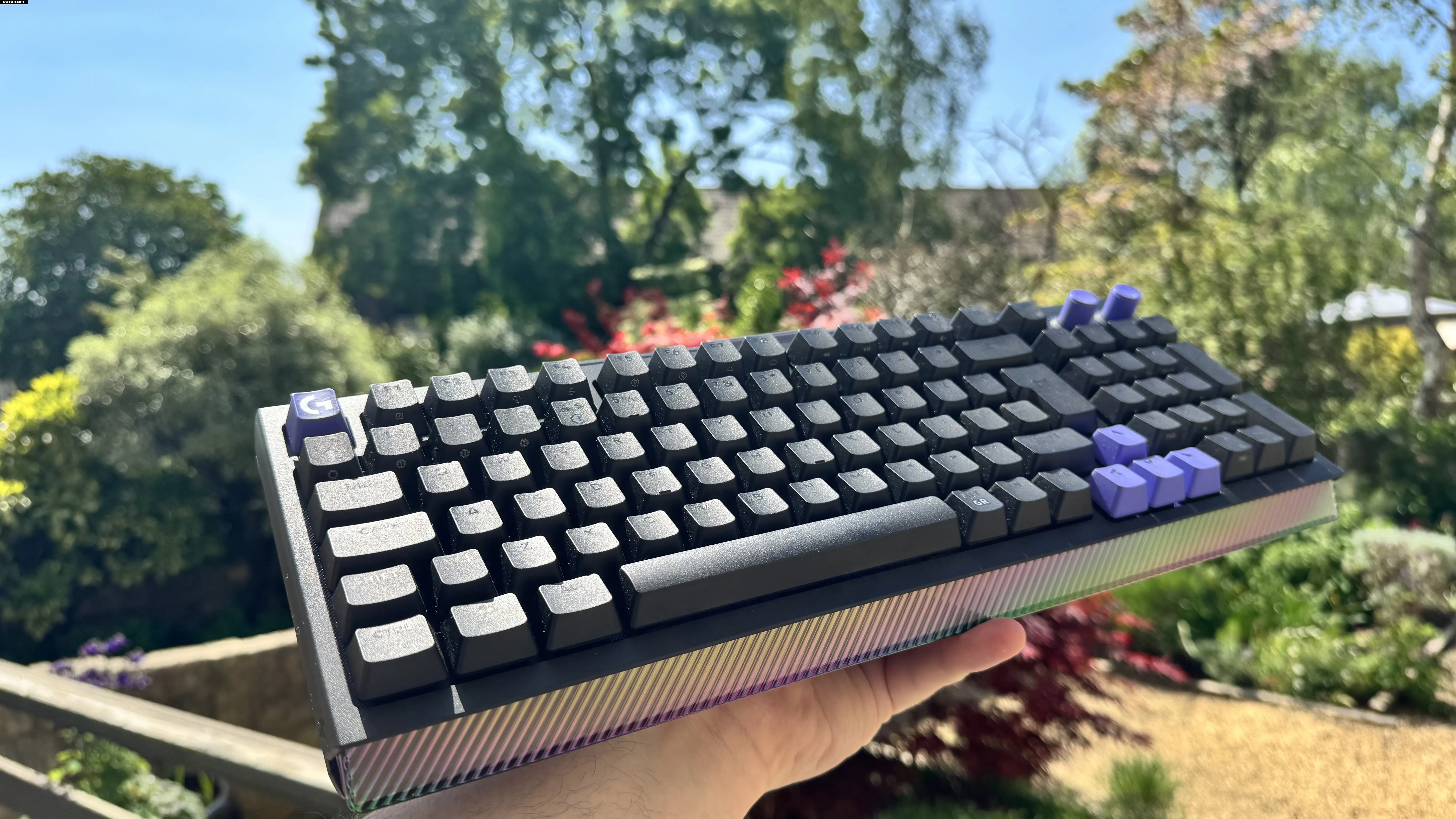 Источник: pcgamer.com ❘ Images: [Future; Простая подставка для запястий, но эффективно дополняет световую полосу. Future; Обратите внимание: у двух гнезд для переключателей справа черное основание, а у тех, что слева — фиолетовое.