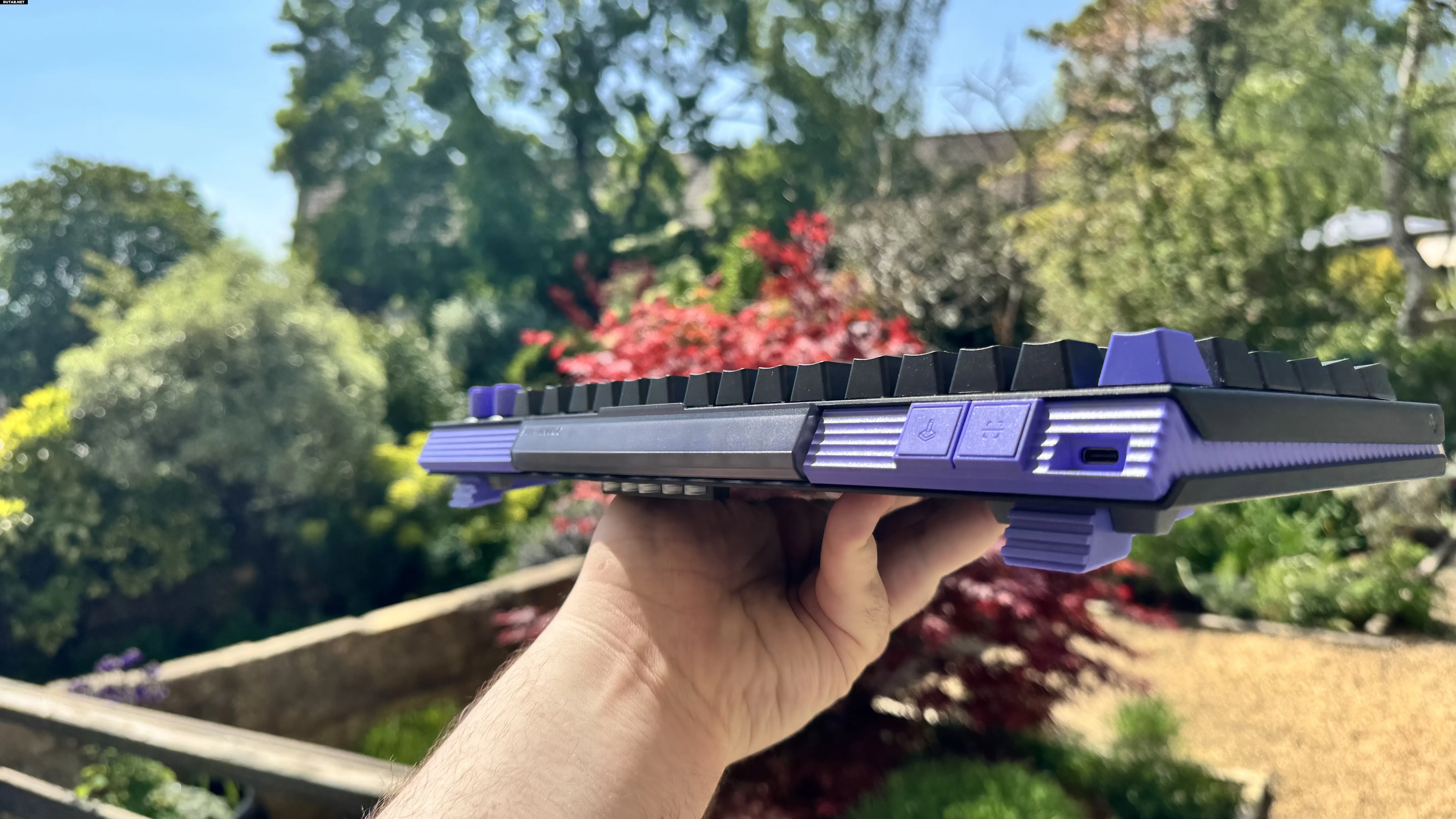 В верхней части клавиатуры есть небольшой отсек для хранения девяти переключателей. Под ним — место для пяти колец SAPP. Ножки клавиатуры выполняют роль съемников для переключателей и колпачков, и при этом ни один элемент не выглядит лишним. Я тестировал 98-клавишную модель в черно-фиолетовом цвете, и должен сказать, что фанат «Евангелиона» во мне очень рад.