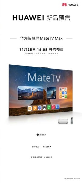 Перед официальным запуском Huawei открыла предварительные заказы на MateTV Max в Китае. Телевизор будет доступен в цвете «Космический серый» (Space Gray) по цене 64 999 юаней (~780 000 руб.).
