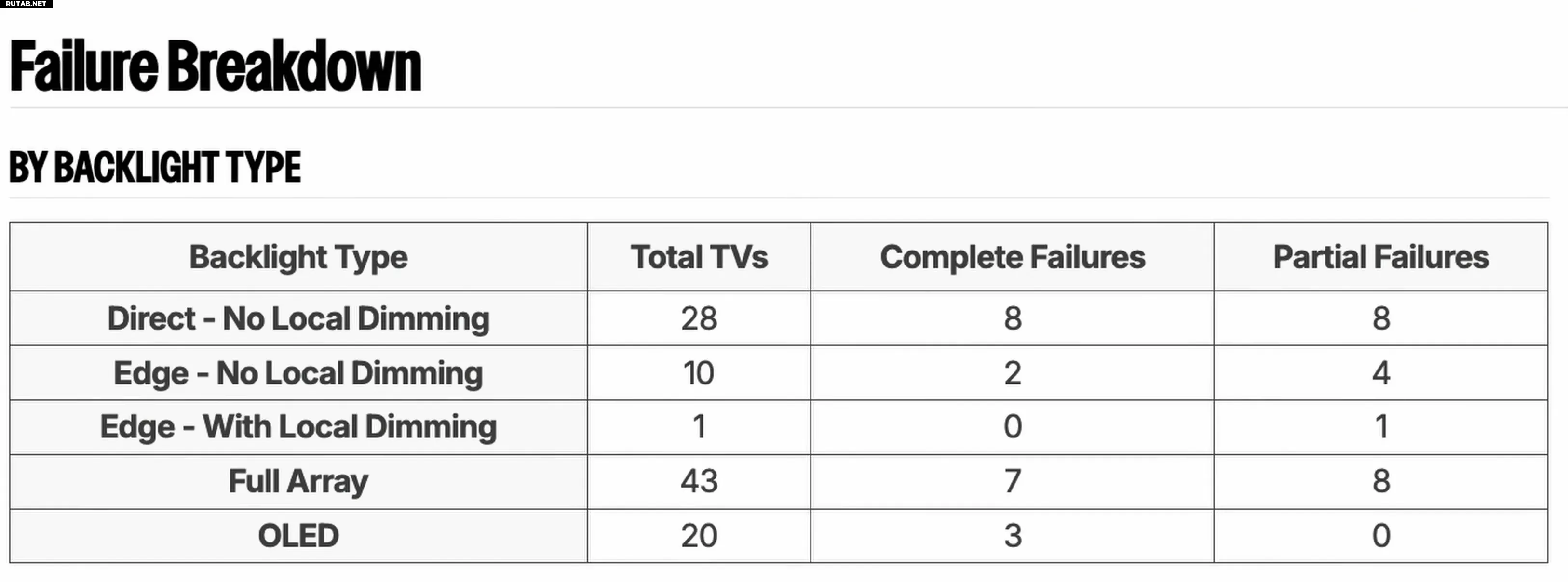 Отлично проявили себя модели с OLED-панелями. Среди 20 телевизоров с панелями WOLED и QD-OLED полный отказ был зафиксирован лишь у трёх экземпляров. Что касается выгорания пикселей, Rtings утверждает, что при обычном использовании это уже не является проблемой для OLED. В ходе теста выгорания, конечно, появлялись, но, как подчёркивают тестировщики, это были «пыточные условия», а не нормальная эксплуатация.
