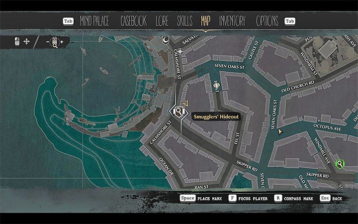 Что касается этого варианта, вы должны найти укрытие контрабандиста самостоятельно, используя информацию, содержащуюся в «Указаниях». Расположение представлено на скриншоте выше - укрытие находится к югу от бара «Семь дубов».