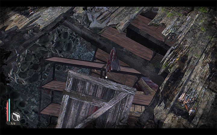 - Проход на верхний этаж перекрыт деревянными досками. Уничтожьте их с помощью ближнего боя.
