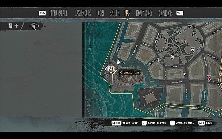 Крематорий - одно из двух мест, которые вы должны посетить во время этого дела (Рид может посетить эти места в любом порядке). Крематорий находится в юго-западной части Рид Хайтс и находится рядом с кладбищем. Используйте лодку, чтобы добраться туда. Расположение представлено на скриншоте выше.
