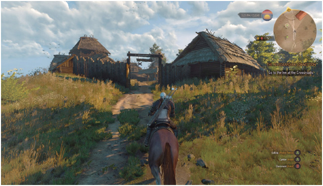 Велен больше всего пострадал в последних войнах, о чем свидетельствуют трупы, раскачивающиеся на дереве, которое вы проходите, и сгоревшие жилища, которые вы наблюдаете, когда следуете по пути через деревню Яворник. Двигайтесь примерно в западном направлении до края реки, к северу до переправы через реку, а затем поперек и вверх по холму в корчму с деревянными стенами "На распутье". Сойдите с лошади у порога гостиницы и войдите.