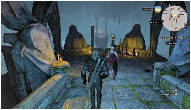 Крики Кейры доносятся с востока (используйте свое Ведьмачье чутье, чтобы «увидеть» звуковой импульс, указывающий направление). Двигайтесь к лестнице и пройдите через арки из центральной ямы и следуйте по комнатам (следя за врагами по пути), пока не дойдете до комнаты с обломками. Похоже, Кейра не является поклонницей крыс; создайте бомбу (Картечь, Самум или Танцующая звезда) или используйте Игни или Аард и уберите два больших крысиных гнезда в этой области, прежде чем она сбросит свой защитный щит. Поговорите с Кейрой, и убедите ее продолжать идти.
