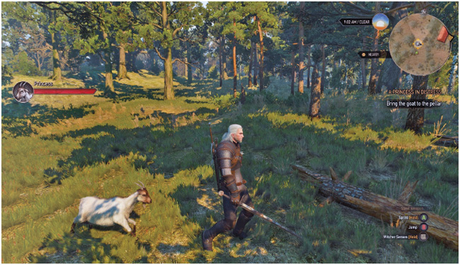 Вы автоматически получаете колокольчик ворожея, таким образом используйте его сейчас. Затем направляйтесь в лесной массив в западном направлении, за домом ворожея. Когда вы достигнете целевой области, используйте ваше Ведьмачье чутье, чтобы отследить последние движения козы (и приемы пищи). Когда вы видите козу, подходите медленно, звоня в колокольчик, когда вы в пределах нескольких метров или около того.