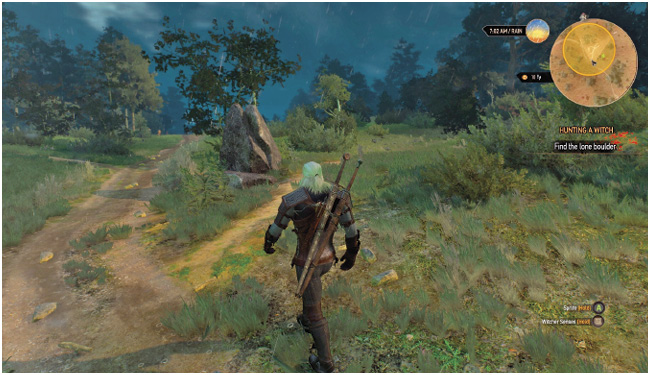 После некоторых ответов Кейра признает, что эльфийский чародей тоже спрашивал о Цирилле. Парень был в маске и попросил Кейру привести Цири к нему. Судя по всему, он прячется в каких-то эльфийских развалинах в юго-западной глуши к северо-западу от деревни Стёжки. Согласитесь посетить это место, и вы автоматически отправитесь туда. Начинается главное задание: На ощупь.