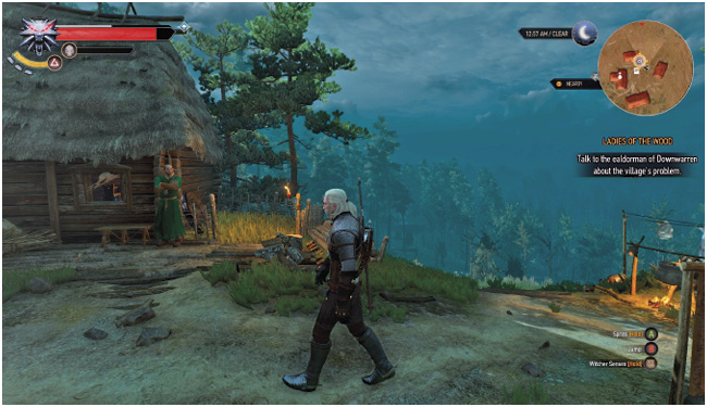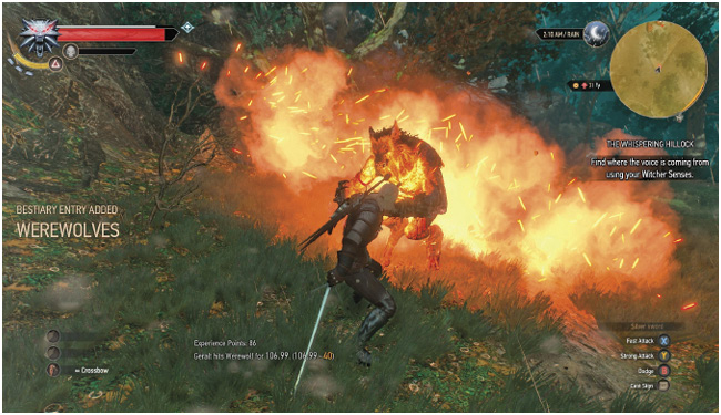 Голос и следы ведут вас к поляне возле холма, где бродит грозный волколак. Он должен быть убит, иногда вместе со своими двумя братьями-волками. Похоже, источник зла заключен в ряд уступов (используйте свое ведьмовское чутье, чтобы найти их), и в мрачную пещеру, заполненную болтающимися корнями деревьев. Текущее задание временно прерывается, и активируется квест Шепчущий холм.