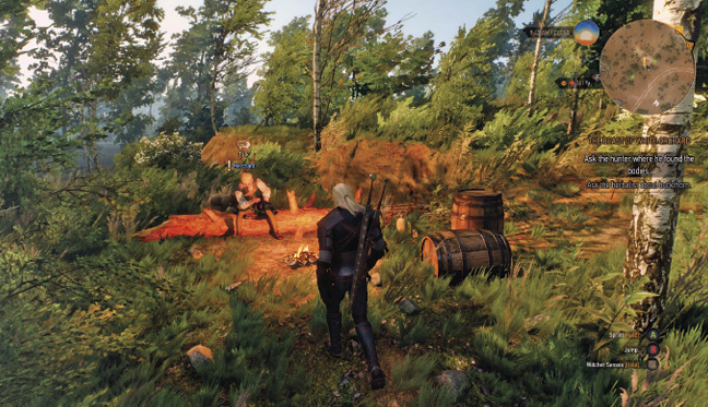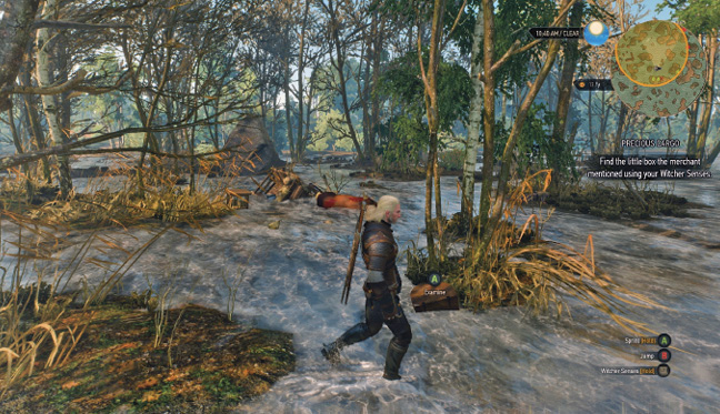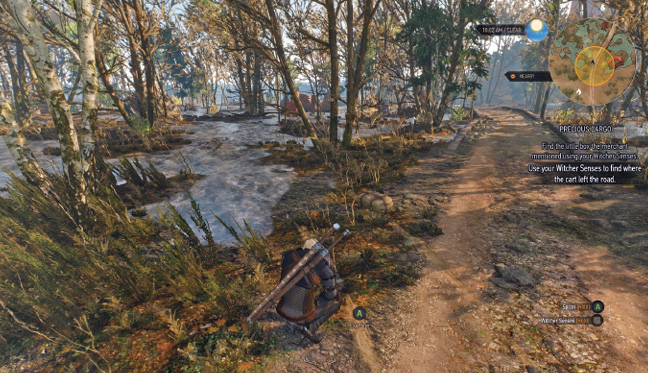 Используйте свое ведьмачье чутье и осмотрите следы тележки, которые ведут в болото. Затем проберитесь в воду. Несколько моментов спустя, вы должны наткнуться на телегу, пронизанную стрелами. С чутьем осмотрите мертвую лошадь и останки торговца - оба поражены стрелами из лука.