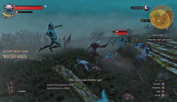 Пока ворожей жестикулирует, используйте свой меч на нескольких утопцах, которые атакуют с края круга, ближайшего к озеру. Эти пять влажных врагов поддерживаются водной бабой. После этого Ворожей вызывает Амброса из мерцающего огня.