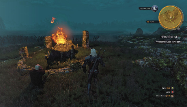 Прорицатель и друг коз, Ворожей подходит и просит вашего присутствия на ритуале, который начинается сегодня вечером на острове Коломница. Нужно провести обряды, и вас нанимают, чтобы обеспечить защиту от проклятых душ, которые могут нарушить церемонию. Согласитесь помочь, а затем отправляйтесь к стоячим камням в юго-западной части острова. Собрание крестьян уже увлечено ворожеем. У вас есть еще один шанс помедитировать и подготовиться к грядущим битвам. Затем ритуал начинается всерьез.