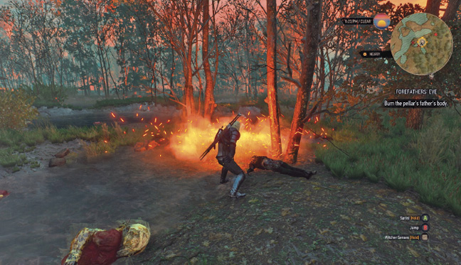 Плывите или возьмите лодку через озеро к болотам и исследуйте край болота, к западу от сиротской деревни. Труп находится в удивительно хорошем состоянии (вы можете видеть, где Ворожей разбил череп своего отца). Победите всех гнильцов, бродящих по округе, используйте Игни, чтобы поджечь останки.
