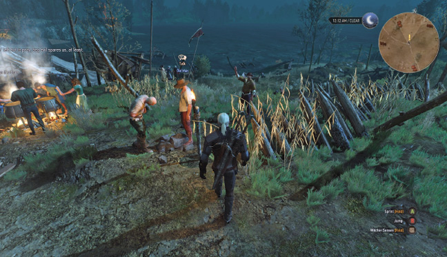 К югу от реки, недалеко от реданского поста, находится довольно шумный лагерь беженцев. Найдите подозрительного торговца рядом с костром и поговорите с ним. Он объясняет, что реданцы держат все броды, которые пересекают Понтар (включая вход в Оксенфурт), но пропуск позволит вам пройти.