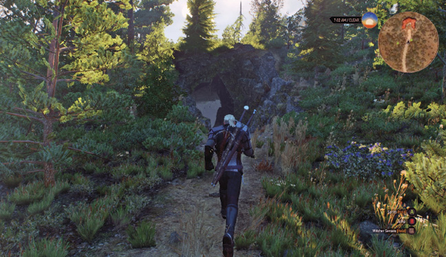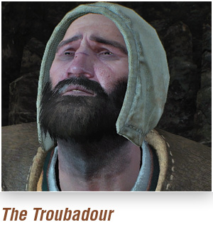 На юго-востоке ард Скеллиг пройдите на восток от Палисада, следуя по лесной тропе, прежде чем свернуть на северо-восток и найти второстепенную тропу, ведущую ко входу в пещеру, изображенную ниже. Войдите в пещеру, где вы услышите жалобные крики трубадура. Он умоляет вас не будить его спящую "возлюбленную". Он кажется взволнованным.