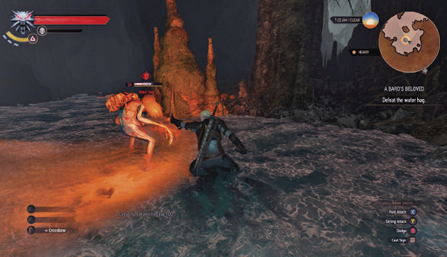 Пройдите глубже в пещерный туннель, где будет вода под ногами. В конце этой пещеры просыпается нечто обвисшее и гротескное. Кажется, объект привязанности трубадура - это водная баба. Может быть, все дело в ее характере? Нет, она хочет вас убить. Убейте отвратительного монстра и соберите ингредиенты с трупа. Бард тем временем исчезает, а задание заканчивается.