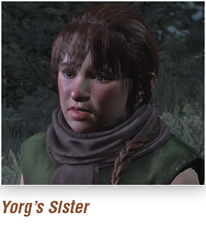 Когда вы в следующий раз окажетесь в деревне Рогне (деревня прямо к югу от скалистого мыса, к которому прикован Йорг), подслушайте некоторых жителей деревни у костра, обсуждающих изгнание Йорга. Его сестра пытается защитить своего брата, а затем в бешенстве уходит прочь. Следуйте за ней и поговорите. Она рассказывает, что её дядя Греттер «сделал с ней что-то», и что она рассказала об этом Йоргу, что и послужило причиной убийства. Правда она солгала о насилии, так как ей просто не нравился толстый и вонючий дядя Греттер. Завершите квест, сообщив сестре, что вы освободили её брата, или, что она должна усвоить урок лжи.