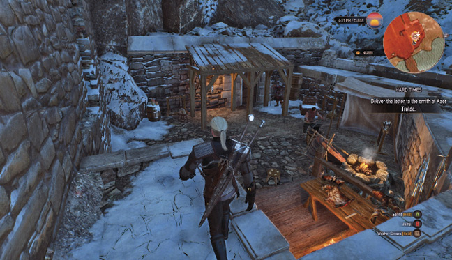 | Задачи: Используйте свое ведьмачье чутье, чтобы исследовать сломанную телегу. Идите по следам, ведущим от сломанной телеги. Ближайший указатель: Юг от Лагеря горняков. |
