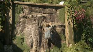 С платформы снаружи перепрыгните на толстую деревянную балку и следуйте по ней на скалу. Прыгайте на горку впереди вас и используйте веревку, чтобы (еще раз) качнуться и прыгнуть на стену, по которой можно лазить, на дальней стороне пропасти.
