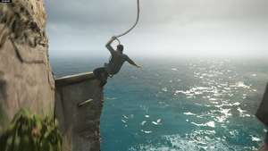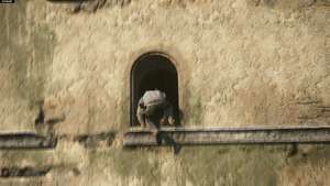 Заберитесь на выступ и используйте веревку, чтобы перелезть через пропасть и добраться до основания тюремной башни. С другой стороны, используйте другую точку захвата впереди, чтобы качнуться к стене, по которой можно залезть на выступающей из угла руин.