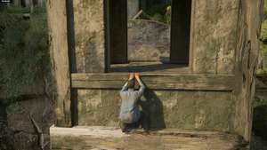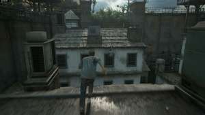 ↑После того, как кат-сцена с Варгасом закончится, спрыгните со сломанной лестницы впереди вас и соскользните по сланцевому холму, затем прыгните, чтобы ухватиться за выступ перед вами и взобраться на твердую землю. Идите к стене слева вверх в небольшой двор, затем идите к верстаку в дальнем конце двора, чтобы собрать веревку и схватиться.