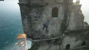 Внутри башни оставайтесь на верхнем этаже и с помощью веревки стяните доски, закрывающие окно в дальнем конце комнаты. Прыгайте к окну и вылезайте обратно наружу, затем используйте выступы справа от вас, чтобы обогнуть угол башни и подняться вверх к камере Бернса.
