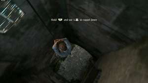 ↑Собрав крест, взаимодействовать с дверью камеры, чтобы взломать её, затем спрыгивайте на этаж ниже. Используйте точку привязки, чтобы прикрепить веревку и спуститься вниз, затем поверните поперек, чтобы ухватиться за уступ напротив вас.