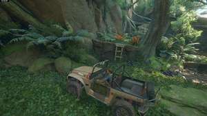 Выйдите из джипа и возьмитесь за крюк лебедки, затем оберните веревку вокруг деревянных опорных стоек платформы на краю обрыва. Елена будет использовать джип, чтобы снести опоры.