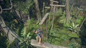 Вернувшись на твердую землю, слева от вас есть стена - идите к ней и следуйте по тропинке, чтобы выбраться на балку. Прыгайте на ветку перед вами и раскачивайтесь/прыгайте, чтобы добраться до входа в пещеру.