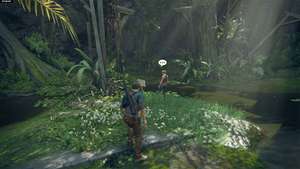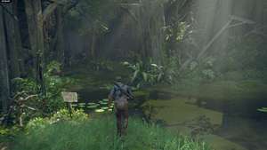 ↑Когда появятся наемники, следуйте за густой растительностью справа. Когда вы достигнете кромки воды, спрыгните и подплывите к платформе напротив вас.