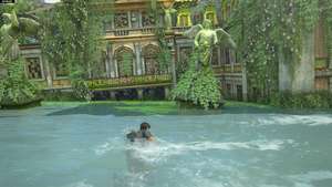 Когда вы восстановите контроль, спуститесь по стене и прыгните с луча на стрелку на статуе, выходящую из воды. Спрыгивайте и плывите к окну с желтой окантовкой затонувшего дома слева от вас.