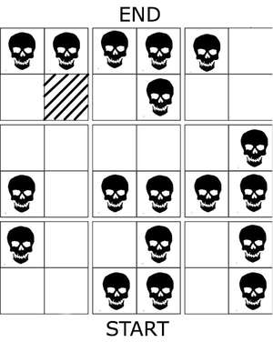 Обратитесь к изображению выше, чтобы узнать о безопасном пути через эту ловушку - если это не очевидно, квадраты, отмеченные гигантским черепом, убьют вас. Достигнув безопасного места на другой стороне, пройдите через дверь и перепрыгните через упавшую колонну слева от вас. Следуйте по тропинке в хорошо освещенную комнату, полную клеток и мумий, и взаимодействовать с дверью в дальнем конце, чтобы использовать найденный вами ключ.