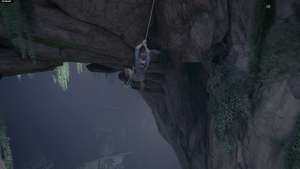Спрыгивайте на скалу под собой и снова ловите себя крюком. Чередуя крюк и каменные опоры для рук, перелезайте по скале справа от вас.