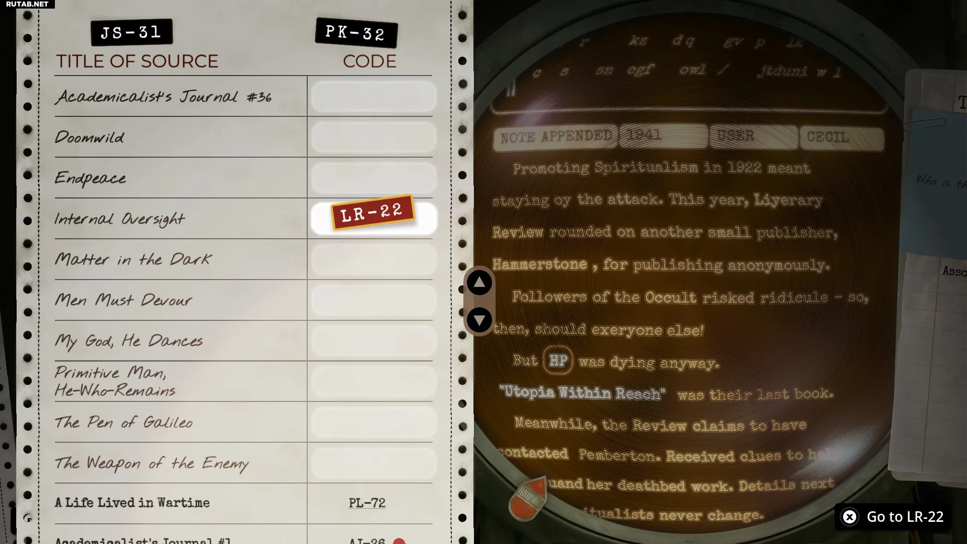 После того как Obra Dinn произвела революцию в детективном жанре, многие её современники «позаимствовали» блестящую систему, в которой вы не узнаете, правы ли вы в чём-то, пока не введёте три верных элемента информации. Это мешает вам просто перебирать догадки, пока вы случайно не наткнётесь на решение. Поэтому я был удивлён, что Inkle не включила здесь такого предохранителя. Как только у меня накопилось достаточно кодов и названий, я мог просто вбивать их в каждое поле для названия книги по списку, пока Абби не подтверждала попадание. «Ха-ха! — самодовольно подумал я. — Так значит, я умнее Inkle!»