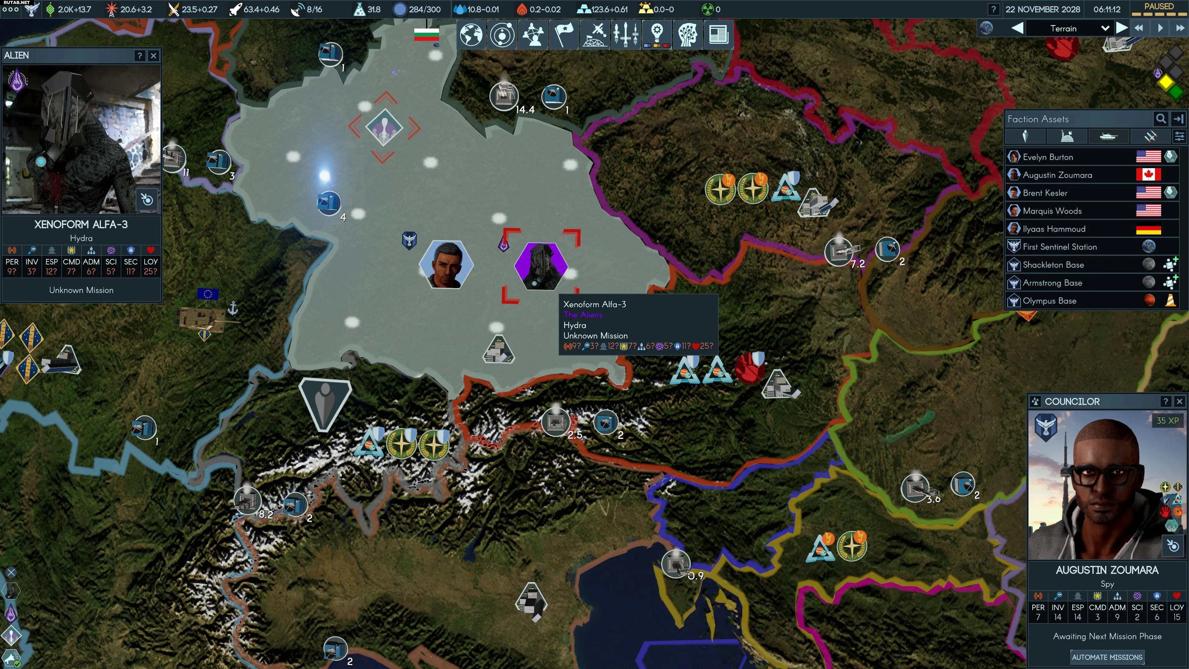 Основные инструменты для взаимодействия с этим обширным уголком космоса — ваши советники. Это нанимаемые агенты с профессиями вроде «Астронавт» или «Технологический миллиардер», личными чертами, такими как «Зависимый» или «Патриарх», и различными заданиями, на которые их можно отправить, например, «Исследовать активность пришельцев» или «Контролировать государство». Вы управляете не страной, а одной из нескольких фракций с общей идеологией. «Сопротивление» — самая прямолинейная из них, чья цель — просто сражаться с пришельцами и заставить их уйти.