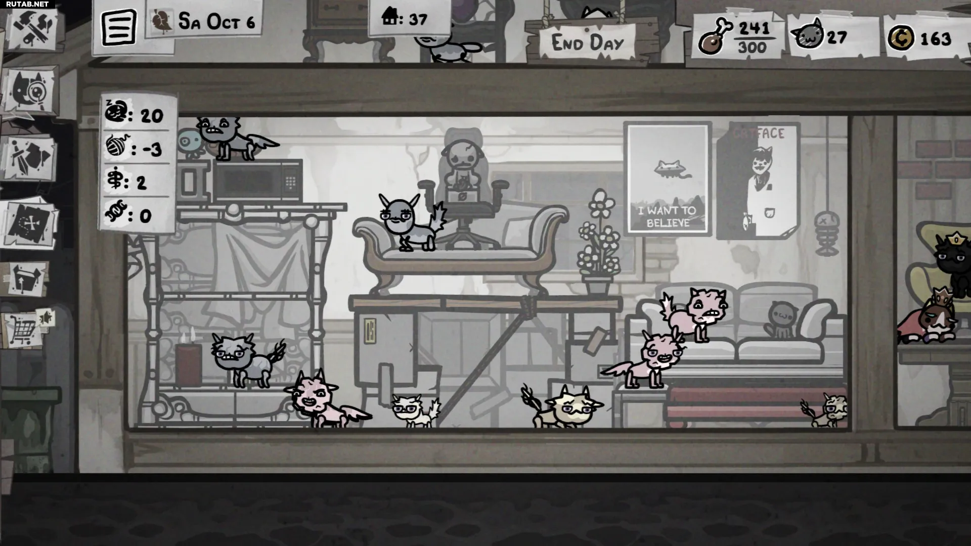 Ваш контроль над кошками намеренно небрежен и ограничен — вы можете размещать их в разных комнатах дома, чтобы изолировать разные группы, и расставлять мебель, влияющую на их поведение, но в конечном итоге у них есть собственный разум. Они спариваются с нежелательными партнёрами, дерутся, формируют отношения и гадят повсюду. Буквально везде. Ваша роль — не идеально контролировать колонию, а мягко подталкивать события в нужном направлении, постепенно улучшая генофонд и максимально используя любые неожиданные синергии, которые возникают.