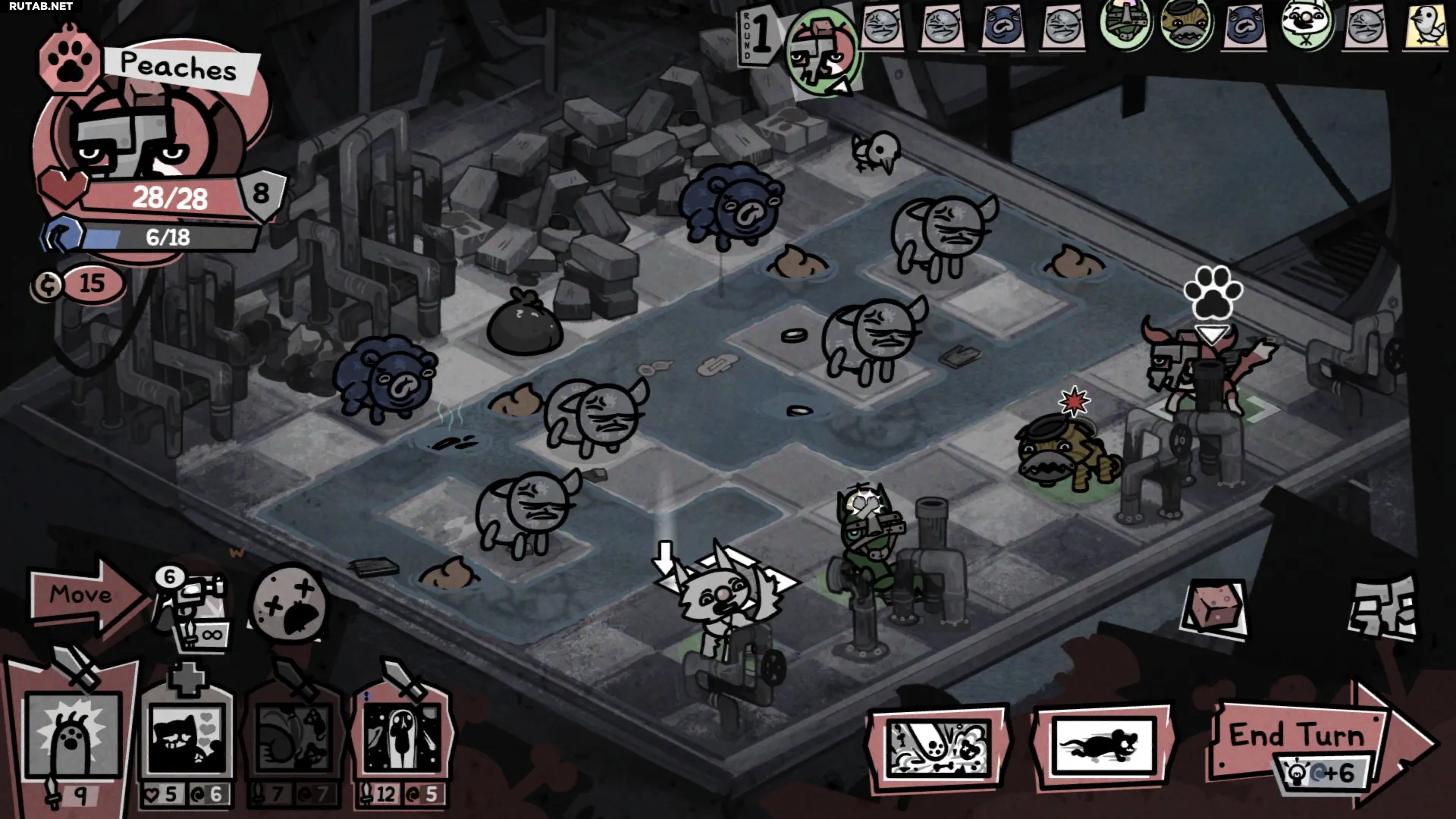 Тактической глубины здесь достаточно, чтобы каждая битва была увлекательной, но это не сложные головоломки, и игра куда менее точна, чем Into the Breach или даже XCOM. Сражения часто бывают захламлёнными, и даже с помощью полезного тактического обзора бывает трудно сходу понять, что происходит. Самые важные повороты часто происходят из-за случайных элементов или непредсказуемого поведения, и, честно говоря, это может казаться несправедливым — особенно когда подкрадываются способности врагов, способные разрушить весь забег, например, мгновенно убить кота или заразить его изнурительной болезнью.