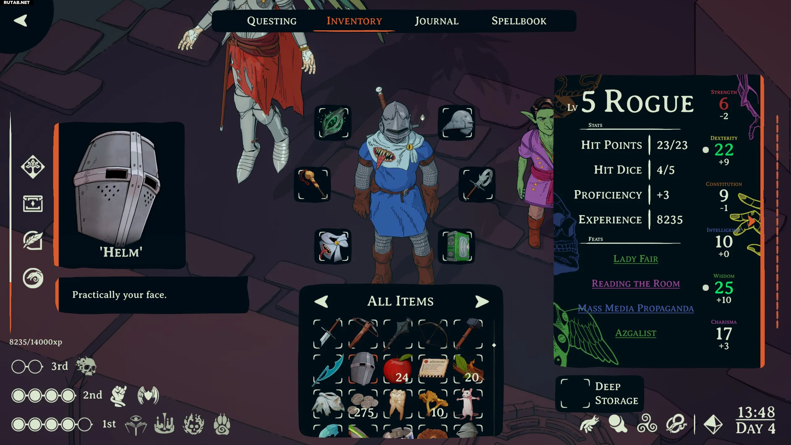 Несмотря на то, что вы играете за Жреца, в диалогах можно настаивать, что вы на самом деле принадлежите к другому классу, и в итоге ваш лист персонажа изменится, отразив это. Как «магический жрец» вы также можете колдовать заклинания волшебника и принять эту сторону своей личности, но с самого начала я выбрал свой любимый класс — «Рога», как его называет сама игра Esoteric Ebb. Разговоры с некоторыми второстепенными персонажами могут открыть и скрытые классы, что стало ещё одним приятным сюрпризом в игре, построенной на удивлении и радости открытий.