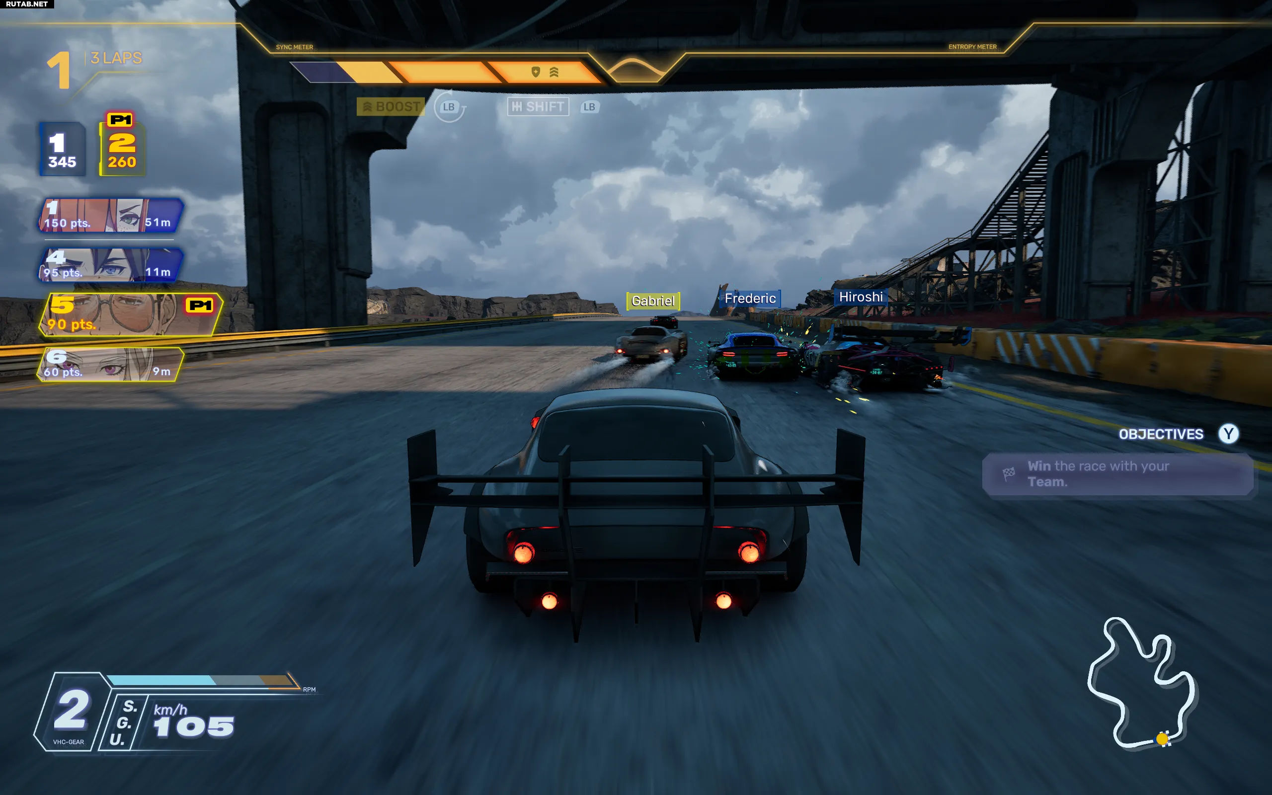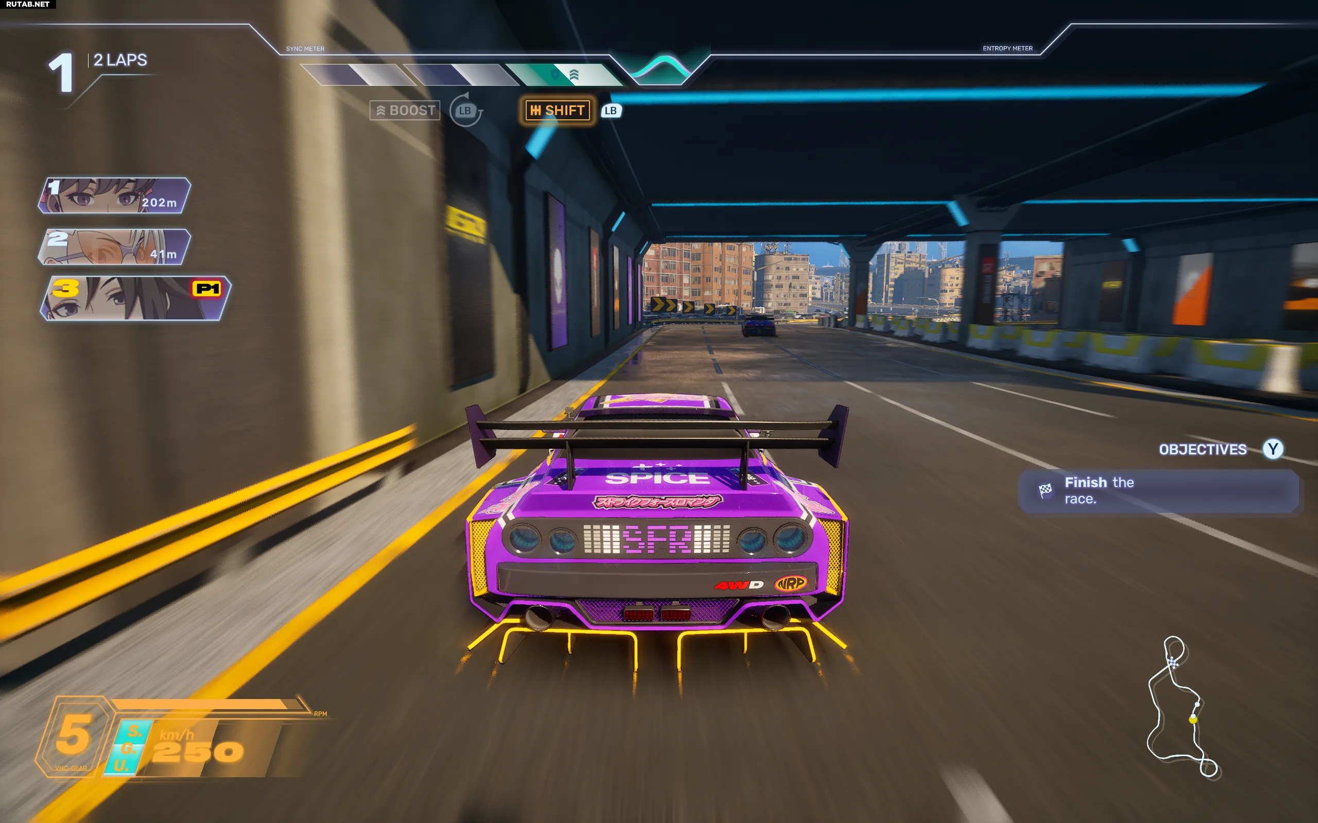 Однако гонки требуют большего, чем просто смена схемы управления. В основе турнира и самого сюжета лежит устройство ECHO — технологическая штуковина, позволяющая использовать ускорения, щиты и атаки. Основы этого слоя достаточно просты: вы выполняете трюки, такие как движение в аэродинамическом мешке за соперником или идеальное переключение передач, чтобы накопить ресурс Sync, а затем тратите его на ускорение. Мне нравится, что это действие тоже основано на времени: если нажать и отпустить кнопку в идеальный момент, ускорение будет сильнее.