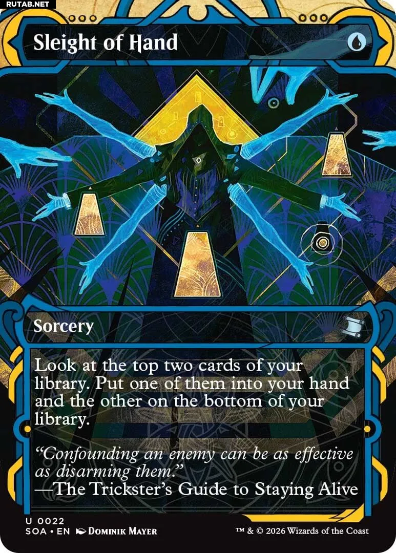 Хотя Sleight of Hand и уступает по силе таким культовым картам, как Brainstorm, её стабильность и низкая стоимость сделали её основой для многих комбо-колод в форматах Modern и Pioneer. Она остаётся эталоном «честного» выбора карт — эффективным, но не ломающим игровой баланс инструментом. Новые версии из «Secrets of Strixhaven» — это отличный шанс пополнить коллекцию этой проверенной временем картой.