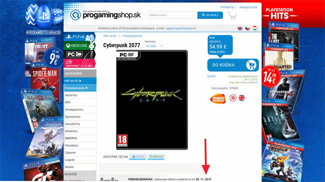 На странице Cyberpunk 2077 в ProGamingShop значится дата — 28 ноября 2019 года. Вроде как в этот день игра станет доступна публике, однако пока никаких подтверждений или опровержений со стороны CD Projekt RED не поступало. Интересно, что утечки пытаются исправить спустя несколько часов, однако на веб-сайте ProGamingShop дата релиза стоит уже больше суток. Вероятно, это только приманка для игроков, чтобы они зашли на сайт магазина.
