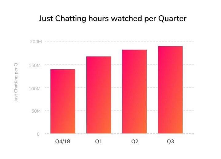 Согласно последнему исследованию StreamElements о состоянии потоковой передачи в третьем квартале 2019 года, опубликованному Medium, категория «Общение» стремительно наращивает аудиторию на Twitch. Кроме того, «Общение» остается единственной категорией, которая неуклонно растет по кварталам в этом году. Трудно сказать, что оказывает решающее влияние на этот рост. Популярность этой категории доказывает, что она может составить конкуренцию игровому контенту в ближайшие годы.