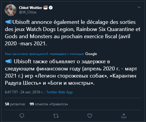 Релизы Watch Dogs: Legion, Gods & Monsters и Tom Clancy's Rainbow Six Quarantine были перенесены на следующий финансовый год, который продлится с апреля 2020 года до конца марта 2021 года. В компании уточнили сразу, что первые два проекта появятся во второй половине 2020 года. Морские сражения в Skull & Bones мы не увидим до следующего периода (после марта 2021 года). Соответственно, компания сократила свои годовые финансовые цели на текущий финансовый год (с 2,1 млрд. евро до 1,4 млрд. евро).