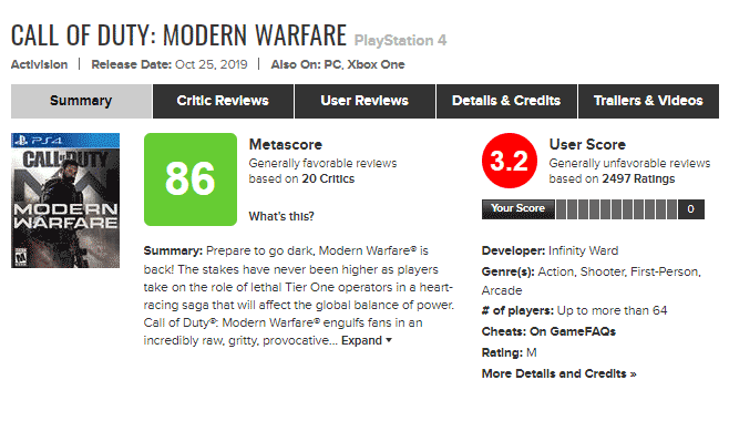 игра оказалась в центре скандала: с точки зрения многих игроков, вместо обещанной "серой морали" в игре вновь оказались только "злые русские". И теперь пользователи из СНГ отомстили шутеру на Metacritic. Call of Duty: Modern Warfare получила чрезвычайно высокие оценки от журналистов и блогеров, однако оценки игроков на Metacritic у неё оставляют желать лучшего. Похоже, что большую часть наиболее низких оценок игре оставили русскоязычные геймеры, которые обвиняют разработчиков в "