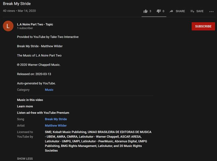 Warner Chapell Music случайно загрузила на YouTube песню, которая является частью саундтрека для второй части LA Noire (LA Noire: Part Two). Песня называется Break My Stride. Версия, которая является источником утечки, уже удалена с платформы, но пользователям интернета удалось увековечить её описание (скриншот ниже).