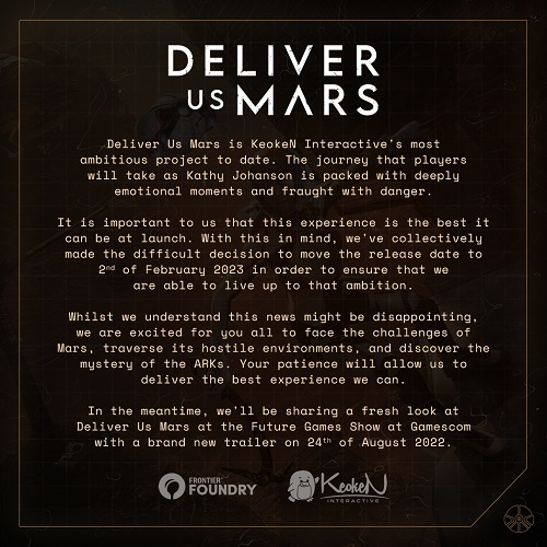 Как выяснилось, в указанный день Deliver Us Mars не выйдет — в целях повышения качества продукта релиз перенесли на 2 февраля 2023 года. Новый трейлер представят 24 августа на шоу Future Games Show в ходе gamescom 2022.