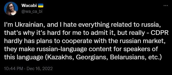 Я украинка и ненавижу все, что связано с Россией, поэтому мне трудно в этом признаться, но CDPR действительно не планирует работать с российским рынком; создавать русскоязычный контент для носителей этого языка (казахов, грузин, белорусов и т.д.).