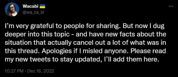 «Я очень благодарна людям за то, что они поделились [моими постами - доп. изд.]. Но сейчас я углубилась в тему — и у меня появились новые факты о ситуации, которые перечеркивают многое из того, что было в этой ветке. Извините, если кого ввела в заблуждение. Читайте мои новые твиты, чтобы быть в курсе, я добавлю их сюда», — говорится в сообщении Wacabi.