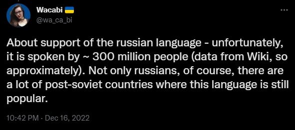 Далее украинка объясняет, какую информацию она нашла, изучив деятельность CD Projekt RED. Прежде всего, она опровергла разоблачения о том, что компания продолжает сотрудничать с россиянами. Также девушку расстроил факт, который она почерпнула из Википедии — как оказалось, на русском языке говорят не только в России, но и во многих других пост-советских странах.