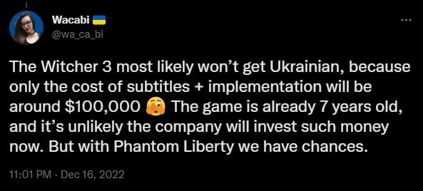 Позже женщина еще раз подняла вопрос об отсутствии украинской локализации в «некст-ген» обновлении «Ведьмака 3». По словам Wacabi, стоимость такой операции составляет около 100 000 долларов, а учитывая, что игре уже семь лет, вряд ли это будет выгодно разработчику. При этом она упомянула о шансе, что в DLC для Cyberpunk 2077 будет полностью включен украинский язык.